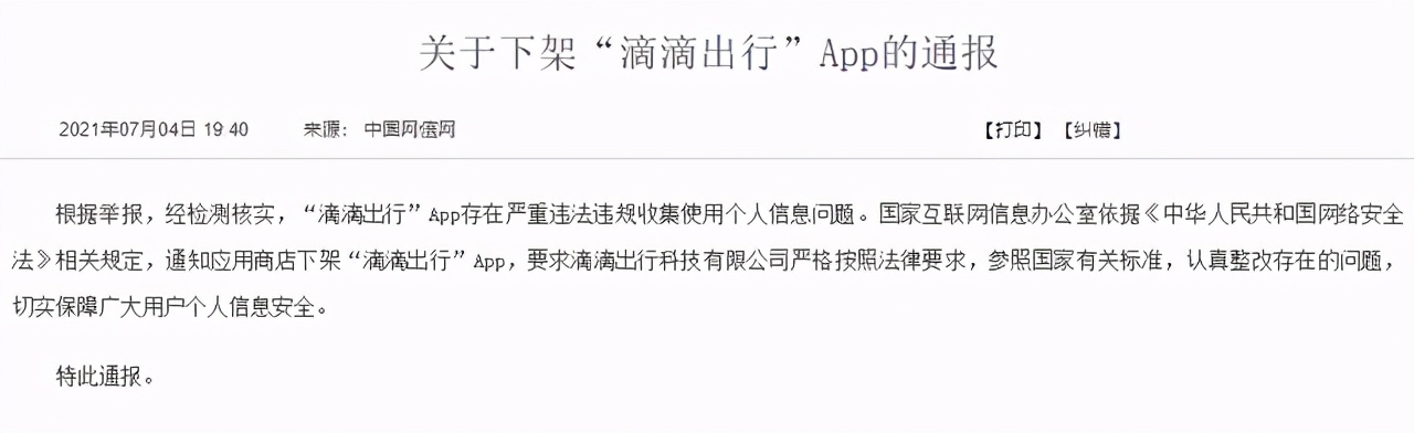 据《人民日报》7月4日报道,国家网信办公布消息,根据举报,在进行检测核实后,滴滴出行App存在严重问题,违法收集使用个人信息,依法下架整改。三天后,7月7日,滴滴微信、支付宝小程序被下架,滴滴官网下架滴滴出行APP。