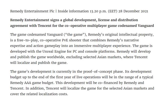 Remedy宣布他们和腾讯签署了协议,为后者开发一个代号为“先锋”的多人合作游戏。