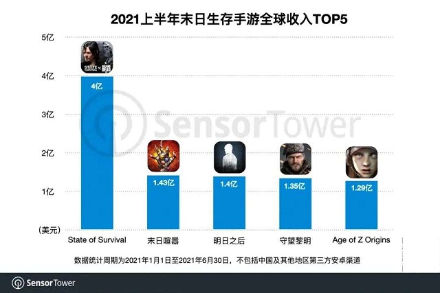 Sensor Tower公布的数据显示,2021上半年末日生存手游全球收入前五名中,全部由中国团队研发。