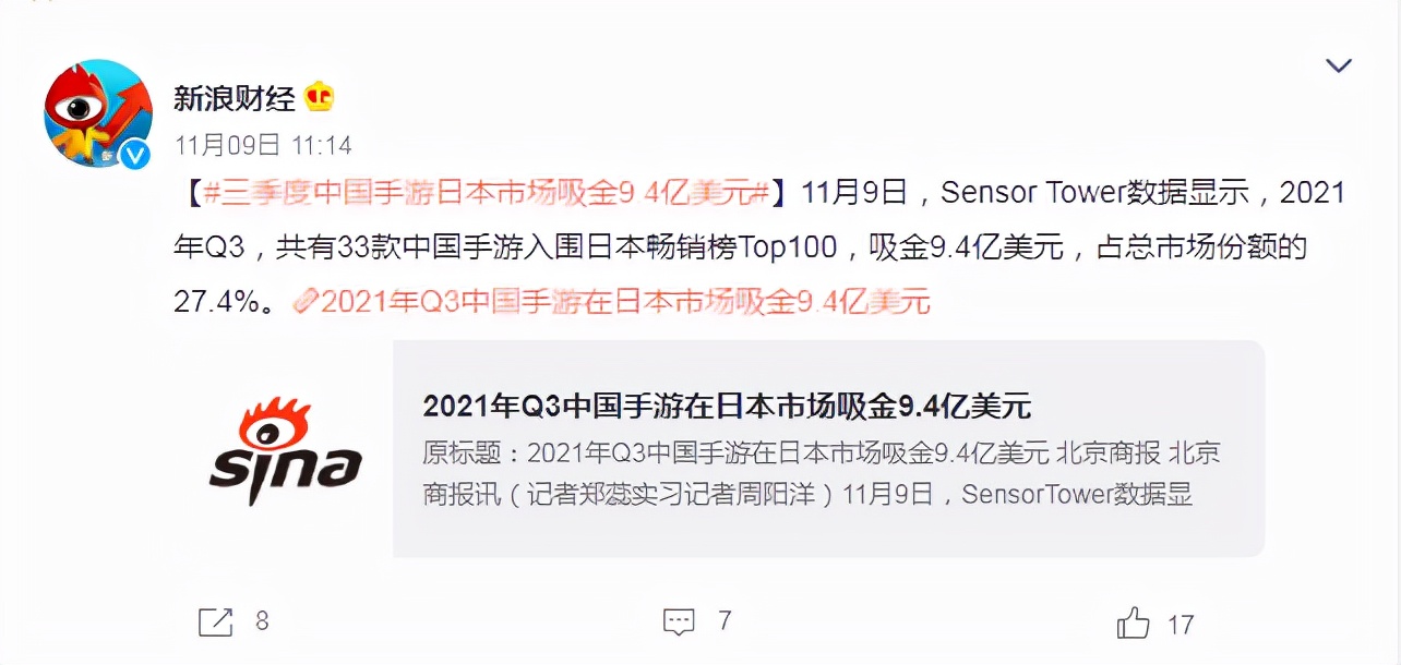 11月9日新浪财经消息,根据调研机构Sensor Tower公布的数据显示,在2021年第三季度,入围日本畅销榜前100名的中国手游多达33款,吸金9.4亿美元(折合人民币60亿)。