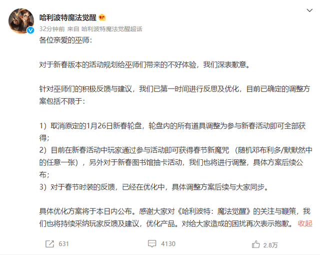 1月20日消息,今日,因新春版本活动规划引发玩家不满,#万人请辞哈利波特魔法觉醒策划#话题冲上热搜,@哈利波特魔法觉醒 官博发文道歉,给出目前的调整方案,并称将对游戏进行优化。