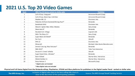 在美国,2021年最畅销以及最高美元销售额的主机都是NS,而最畅销游戏前两名都是《使命召唤》:即《使命召唤:先锋》和《使命召唤:黑色行动 冷战》。