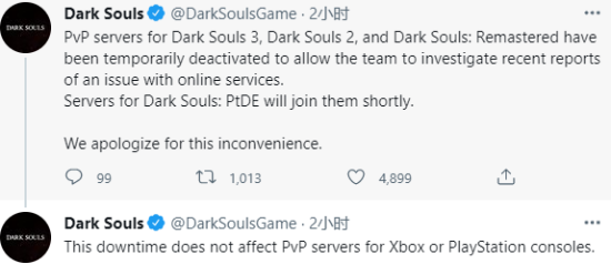 官方在公告中写到:“《黑暗之魂3》《黑暗之魂2》《黑暗之魂:重置版》的服务器已被暂时停用,以便团队调查最近关于在线服务问题的报告。而《黑暗之魂1:受死版》的服务也将被停用”。