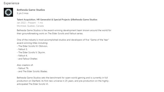 领英页面原文写到:“Bethesda Game Studios为开放世界游戏树立了标杆,目前正在全面制作《星空》,这也是它25年来的首个全新宇宙,同时备受期待的《上古卷轴6》也在进行预制作。”