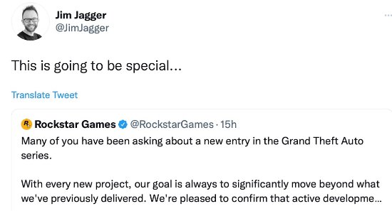 《GTA》的新作正在积极开发中,近日,R星的动画副总裁Jim Jagger发推表示GTA新作将会很特别。