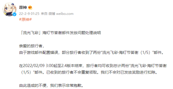 今日(2月9日),《原神》官博发布“流光飞彩”海灯节答谢邮件发放问题处理说明,表示不会对已发放奖励进行扣除。