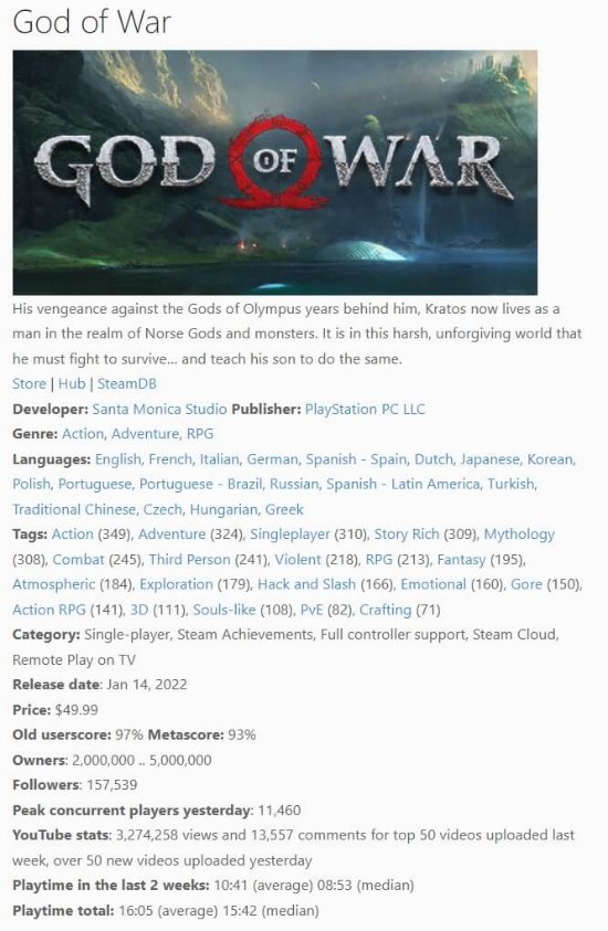 《战神》可能是是迄今为止索尼PC上最畅销的游戏。这款游戏于1月15日发布,据SteamSpy称,它在PC上已经卖出了至少200万份。