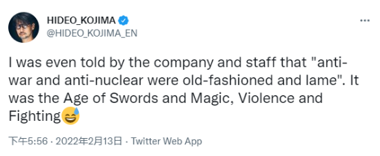 推文称他被公司员工吐槽道:“以反战、反核为内核的游戏已经是过时的‘老掉牙’了”,现在是剑与魔法、暴力与格斗的时代。