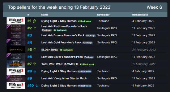 Steam公开了上一周(截至2月13日)的销量排行,第一名由丧尸跑酷游戏《消逝的光芒2 人与仁之战》夺得;由《穿越火线》制作商Smile Gate研发的MMORPG游戏《失落方舟》的各个版本的礼包占据了周销榜一半以上。