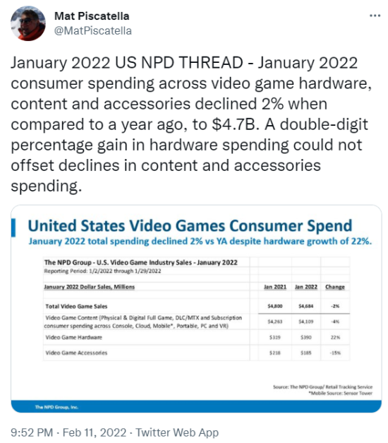 乍一看,这些数字似乎是因为XGP、PS Plus或任天堂Switch Online等订阅服务的用户数量增加。然而,NPD集团提供的数据包括订阅量,而订阅量在过去一年明显也有所下降。这与之前的数据形成了对比,特别是在新冠疫情的高峰时期,消费者的电子游戏支出大幅增加,打破了许多游戏公司的销售数据。 就在2021年第三季度(7月至9月),游戏、硬件和配件的销售额较2020年同期增长了7%。