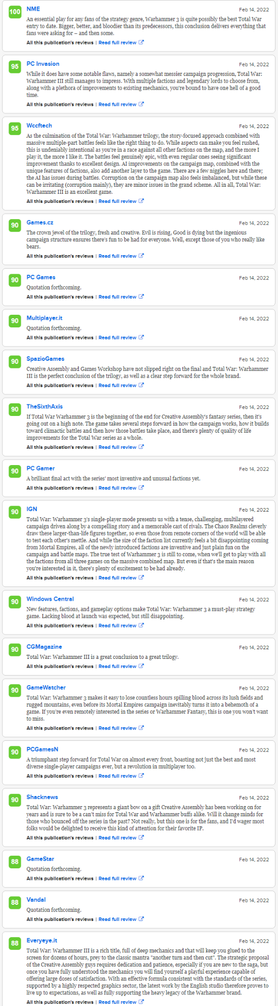 其中Wccftech给出了95分的评价,表示:作为《全面战争:战锤》三部曲的巅峰之作,以故事为中心的方法与大规模的多部分战斗相结合是正确之举。我玩得越多,就越喜欢它。战斗给人以真正的史诗感,由于出色的设计,即使是普通的战斗也有明显的改善。战役地图上的人工智能改进,加上各派别的独特功能,也为游戏增加了另一个层次。但人工智能在战斗中出现问题、战役地图上的腐败问题也让人感觉不平衡,虽然这些问题会让人恼火,但仍然瑕不掩瑜。总而言之,《全面战争:战锤3》是一款优秀的游戏。