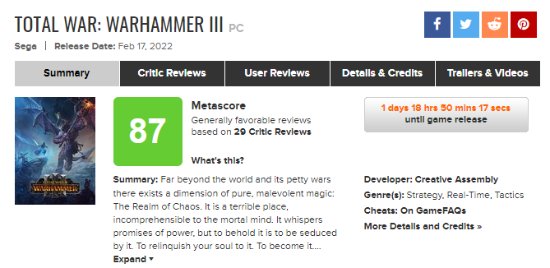《全面战争:战锤3》媒体评分正式解禁,截止发稿前,媒体均分87分,29家媒体全部给出好评,无一中评、差评。