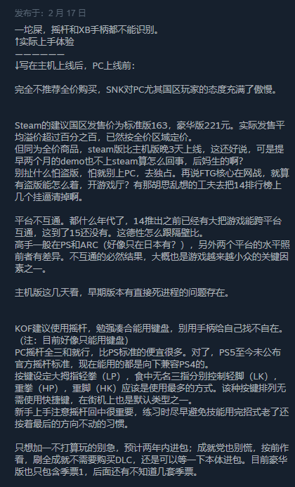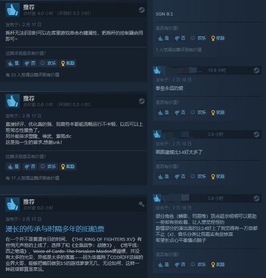 其中给出好评的玩家认为,本作建模对比14好太多了,优化也不错,玩起来很爽,算是一部优秀的《拳皇》系列作品。