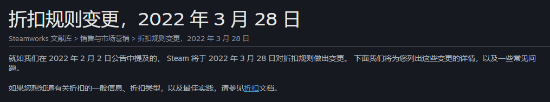 2022年3月28日起,在Steam上提供折扣的间隔时间将从6周改为4周(28天)。 这将意味着产品折扣结束后需要等至少 28 天才能再次提供折扣。